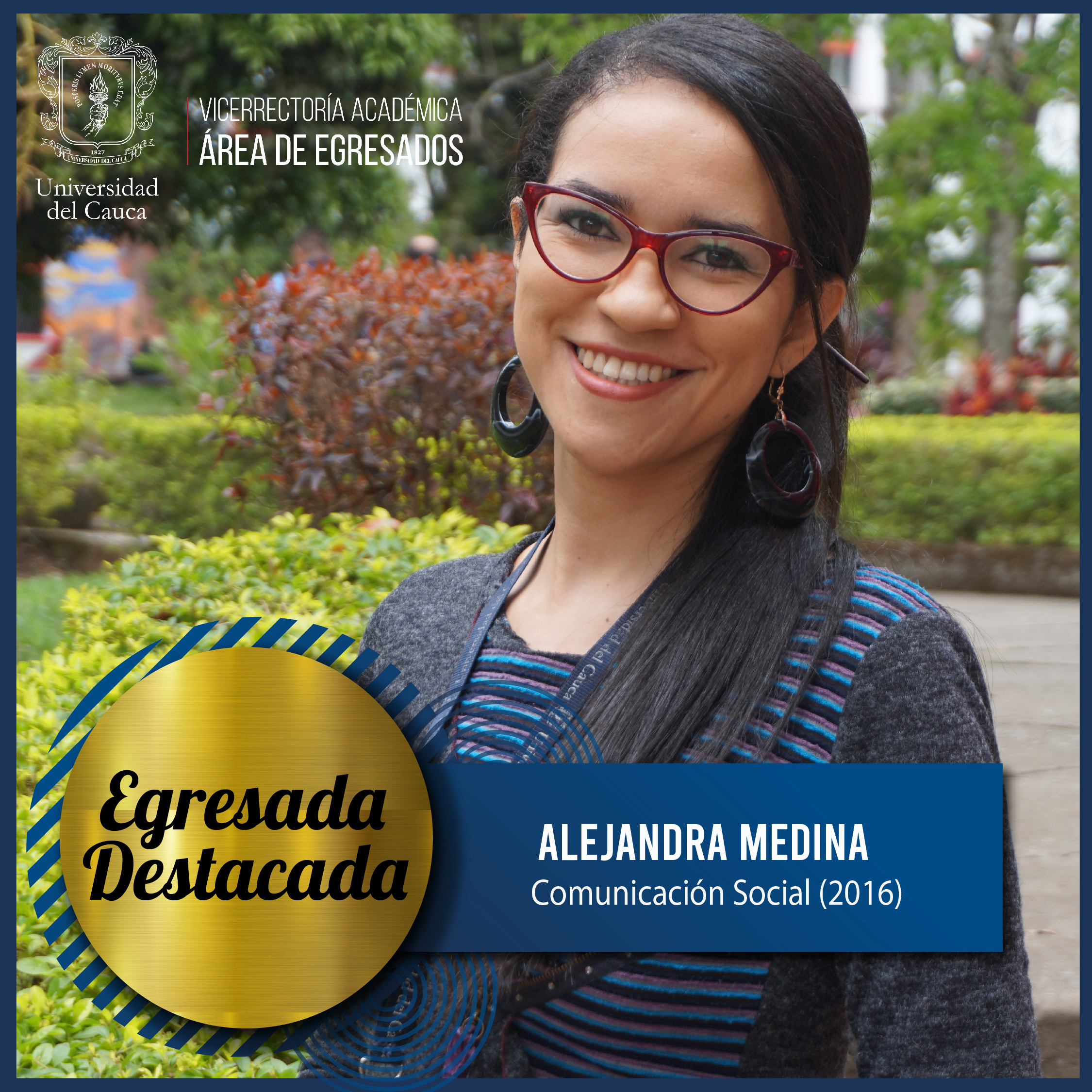 Alejandra Medina es egresada del programa de Comunicación Social del 2016, actualmente está vinculada a la Universidad del Cauca como Coordinadora del Área de Radio y de Unicauca Estéreo, su trabajo consiste en velar por el seguimiento a los contenidos que se transmiten por este medio, que sean de interés público y de la calidad de cada uno de los programas, estar en contacto con todos los colectivos radiales, teniendo en cuenta que la programación de la emisora institucional es extensa y continua.