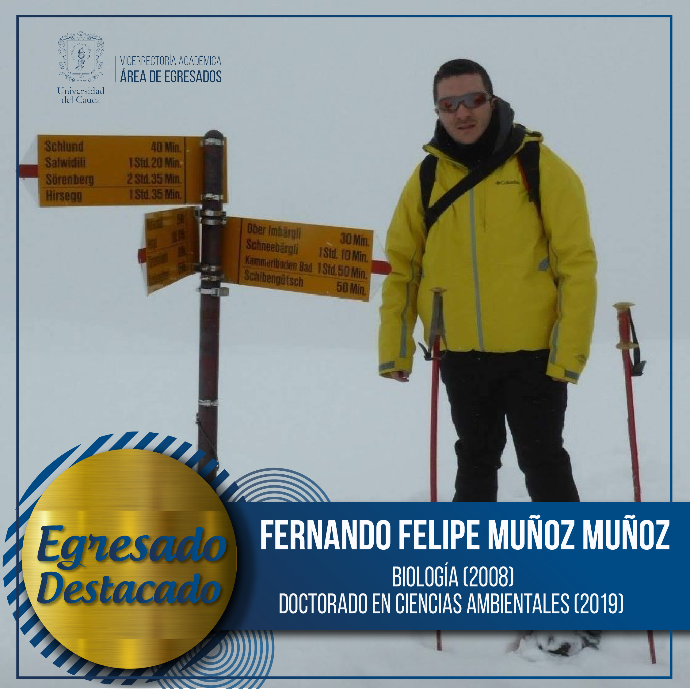 Fernando Felipe Muñoz Muñoz, es egresado del programa de Biología y del Doctorado Interinstitucional en Ciencias Ambientales en el 2019 de la Universidad del Cauca. Él manifiesta haber escogido la Biología como una opción alterna a la Medicina, que era su interés inicial y que por diferentes factores no fue posible; sin embargo, al entrar a esta carrera se da cuenta que tiene muchos enfoques laborales para desarrollar su ejercicio profesional.