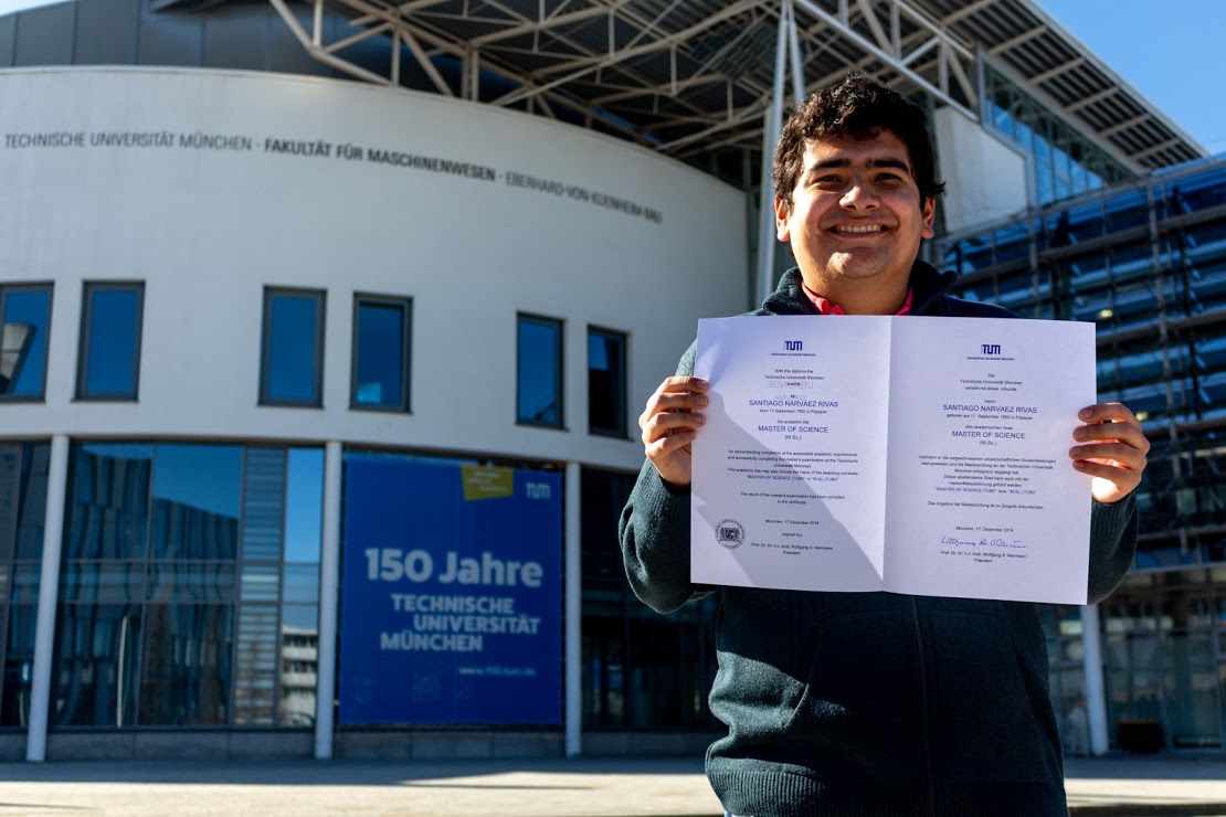 Desde hace más de dos años Santiago ya se encuentra viviendo en la Ciudad de Múnich, Alemania, donde se está terminado sus estudios de la maestría “Computational Science and Engineering”, en la TUM (pos sus siglas en alemán - Technische Universitât Mûnchen), en español “Universidad Técnica de Múnich”. Comenta que al inicio de su llegada en Alemania fue complejo porque extrañaba su familia, pero al ver la calidad en la que se encontraban sus compañeros de maestría le sirvió de motivación para continuar con su proceso de formación. De su maestría destaca su carácter interdisciplinar porque combina tres áreas muy importantes como: Matemáticas, Informática e Ingeniería; sumado a ello esta institución se encuentra entre las mejores Universidades de Alemania.