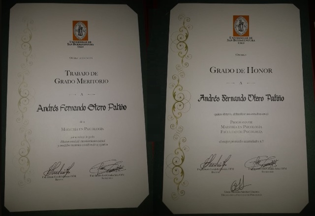 El profesor Andrés Otero Patiño, egresado del programa Música Instrumental / Piano de la Universidad del Cauca, y quien se desempeña como docente de Piano en el Departamento de Música de la Facultad de Artes de la Alma Mater, el pasado jueves 22 de noviembre recibió su título de Magister en Psicología de la Universidad de San Buenaventura de Cali obteniendo dos importantes reconocimientos por su labor investigativa.