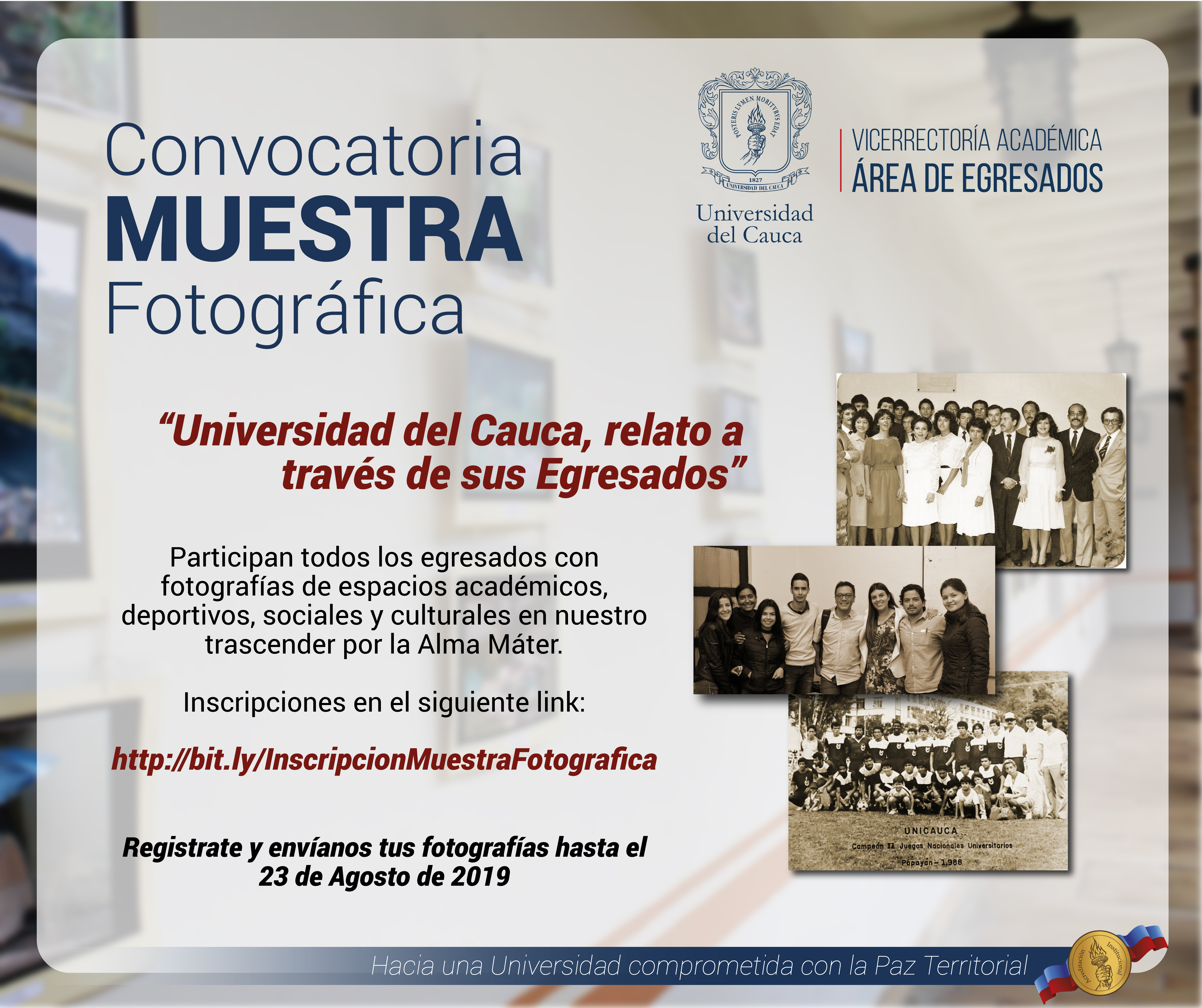 El Área de Egresados de la Universidad del Cauca en su propósito de promover la participación en actividades administrativas, académicas, investigativas, culturales y de bienestar e interacción social de sus Egresados que les permita desarrollar programas, proyectos y acciones conjuntas, realiza Convocatoria para la realización de una muestra fotográfica titulada: “Universidad del Cauca, relato fotográfico a través de sus egresados”.