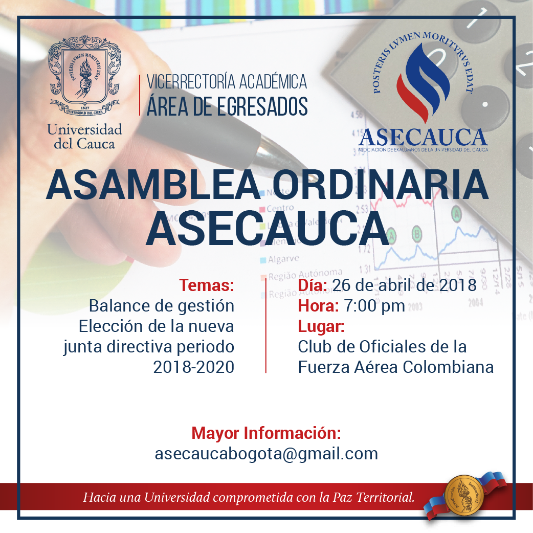 La Universidad del Cauca y el Área de Egresados de la Institución, hizo parte de la Asamblea Ordinaria que organiza la Asociación de Exalumnos ASECAUCA capitulo Bogotá, en donde se presentó la Politica del área de egresados asi tambien como las activiades y beneficios que tienen los graduados del Alma Mater Caucana.