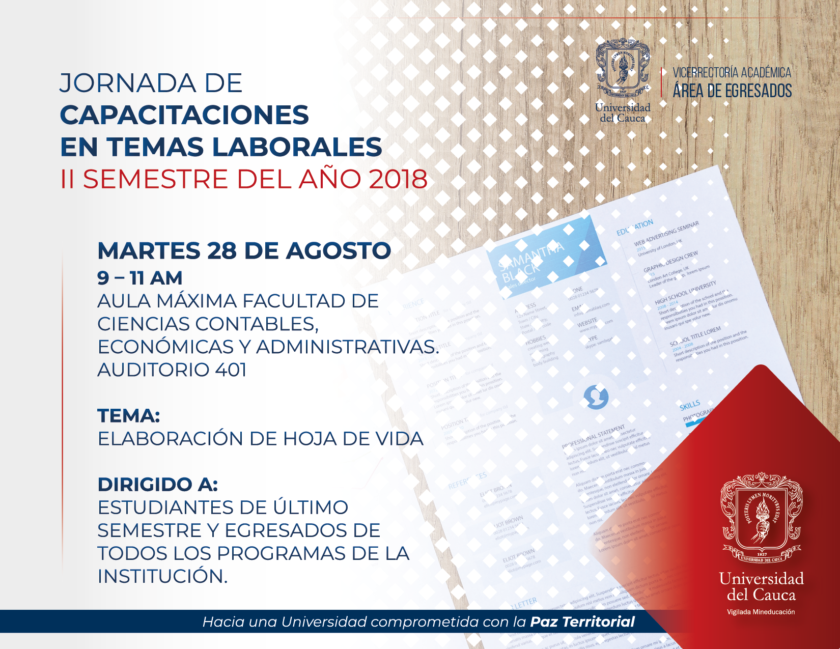 El martes 28 de agosto de 9 a 11 de la mañana inicia con la capacitación denominada ¿Cómo preparar la Hoja de Vida?, en el auditorio 401 de la Facultad de Ciencias Contables, Económicas y Administrativas.