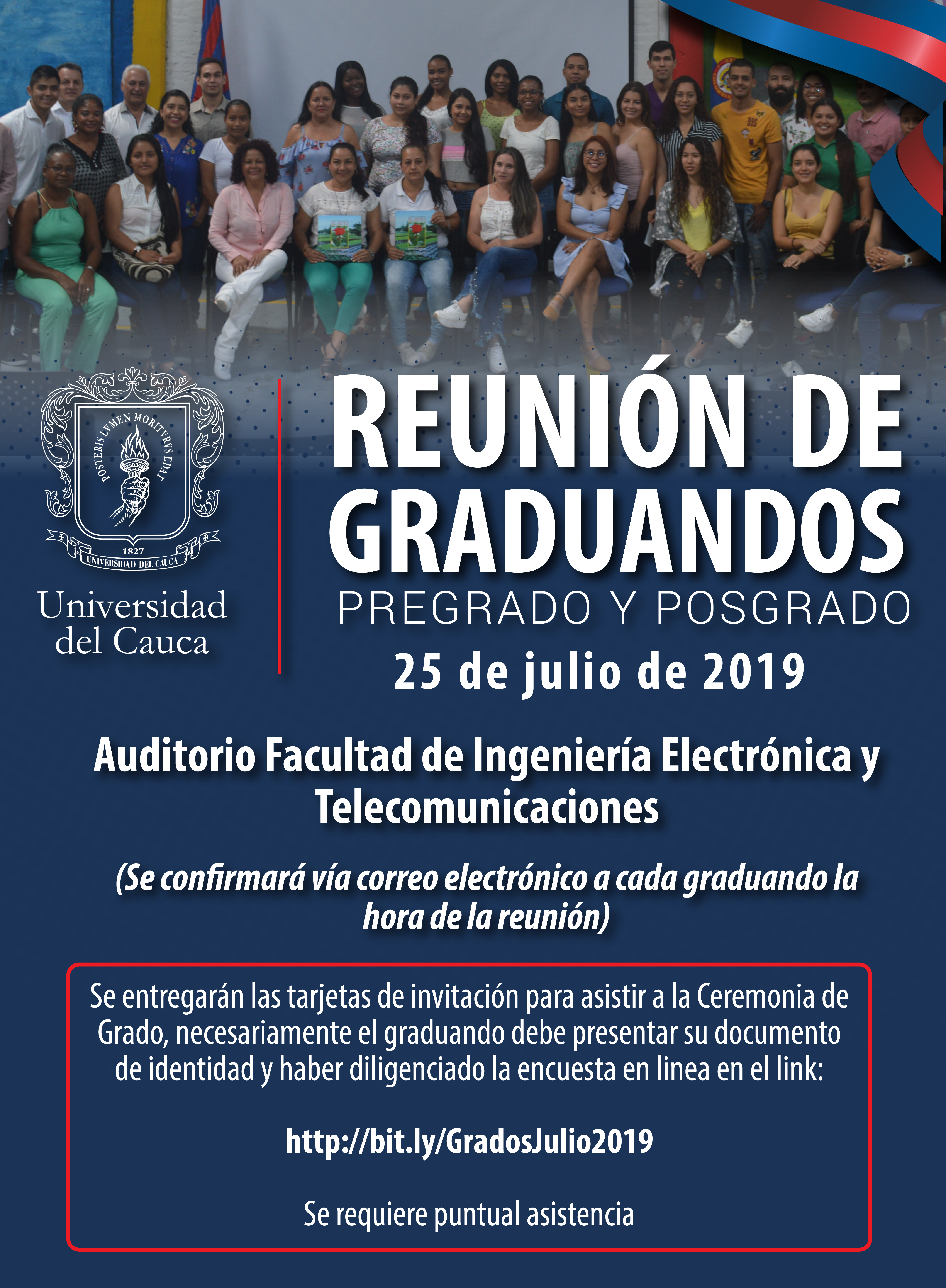 El Área de Egresados de la Universidad del Cauca, realizará la reunión de graduandos. El encuentro con los futuros egresados tendrá lugar el 25 de julio en el Auditorio de la Facultad de Ingeniería Electrónica y Telecomunicaciones, donde se entregarán las tarjetas de invitación para la ceremonia de grado del 26 de Julio.