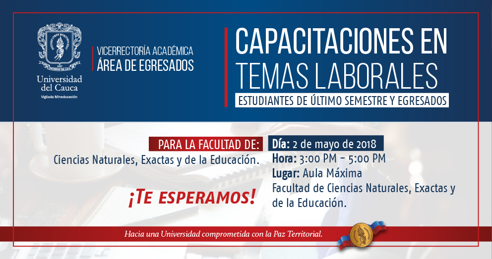 El Área de Egresados de la Universidad del Cauca, realizará una jornada de capacitaciones y talleres a estudiantes de último semestre y egresados en temas laborales relacionados con la presentación de su hoja de vida, performance y entrevista laboral, procurando con estas temáticas aportar en lo personal y profesional.