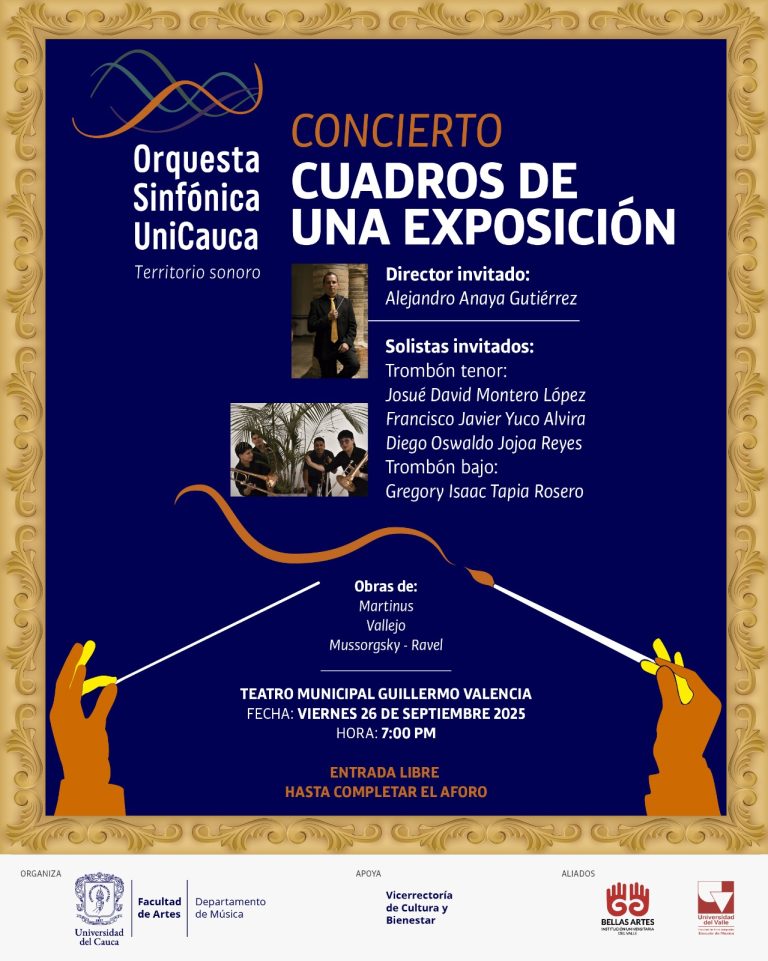 La Orquesta Sinfónica de la Universidad del Cauca invita a la comunidad al concierto “Cuadros de una exposición”, que se llevará a cabo el viernes 26 de septiembre a las 7:00 p.m. en el Teatro Municipal Guillermo Valencia.